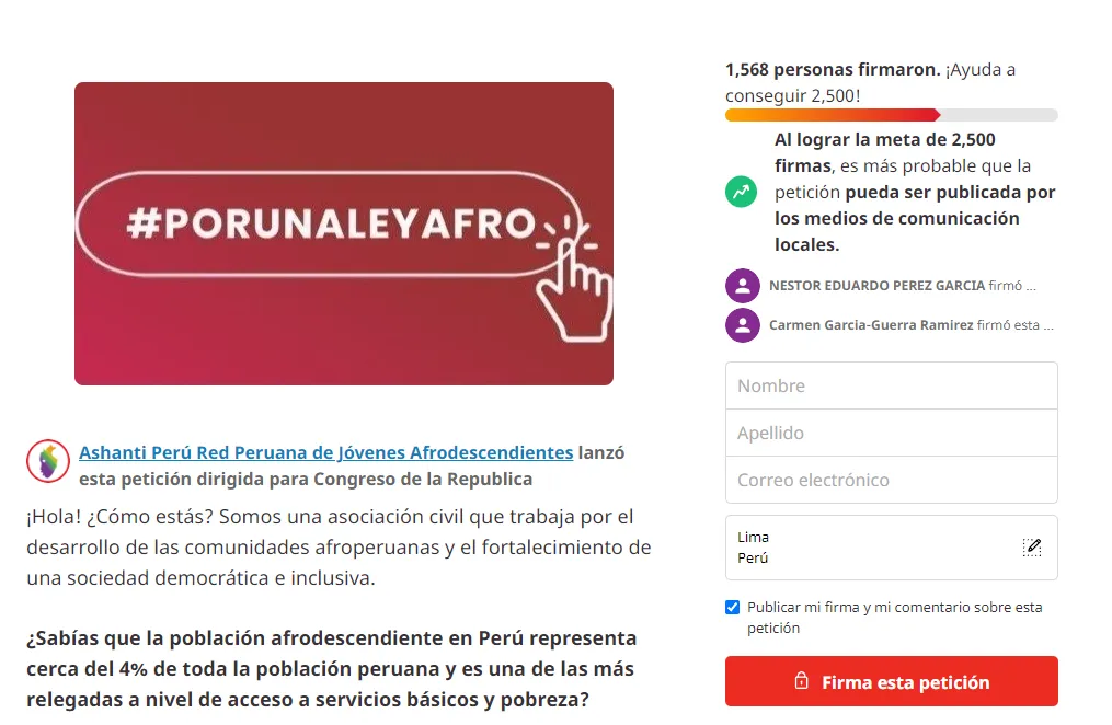 La difusión de la petición se dio en alianza con Change con el fin de lograr una mayor incidencia mediante el apoyo ciudadano a la iniciativa a favor de la Ley para el reconocimiento constitucional del pueblo afroperuano, con el fin de exigir ante el Congreso su adhesión y posterior aprobación.