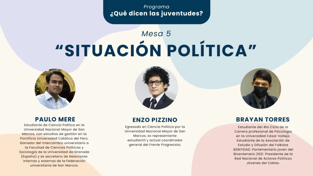 El programa «¿Qué dicen las juventudes?» tiene la finalidad de exponer la diversidad de agendas que poseen los jóvenes peruanos y las demandas insatisfechas que están pendientes de considerar y atender por parte de las autoridades, en un contexto electoral porque nos encontramos próximos al desarrollo de las Elecciones Regionales y Municipales 2022.