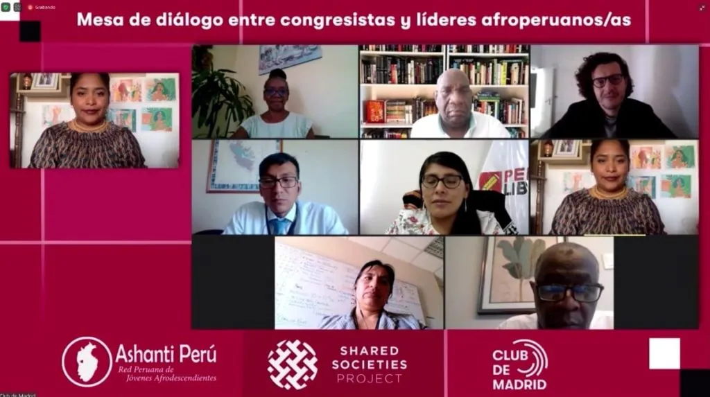 La mesa de diálogo se llevó a cabo el 4 de abril con la participación de la Cong. Margot Palacios Huamán, presidenta de la Comisión de Pueblos Andinos, Amazónicos y Afroperuanos, así como del miembro /staff del Club de Madrid y diversos líderes y lideresas afroperuanas, quienes comentaron y brindaron aportes reflexivos para la incidencia legislativa del pueblo afroperuano, entre ellos, las dos propuestas legislativas:
