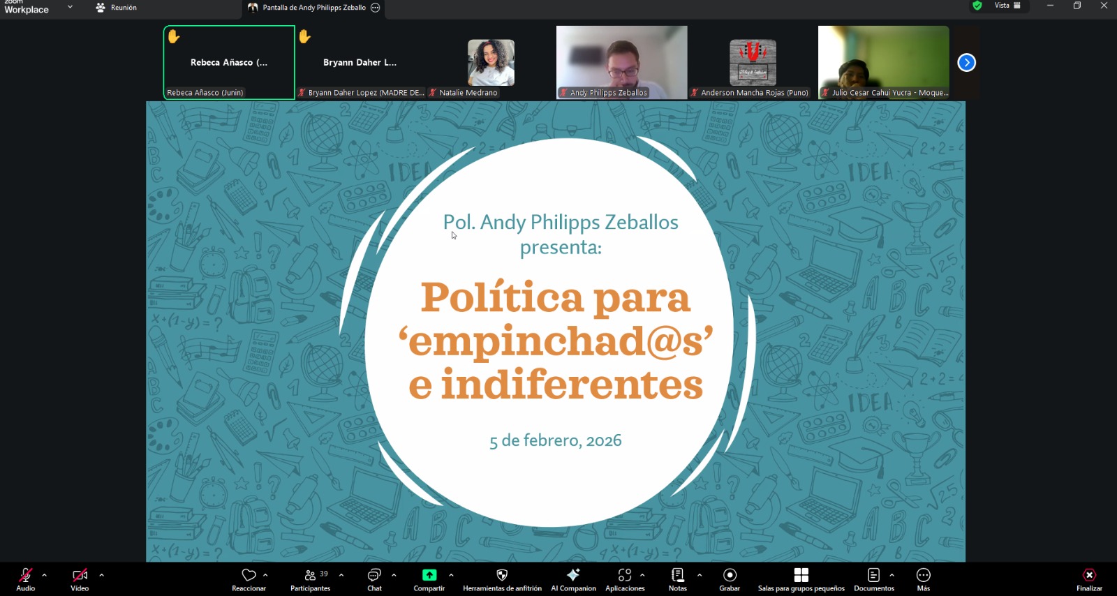 La sesión estuvo a cargo de Andy Philipps Zeballos, politólogo y magíster en Política Anticorrupción por la Universidad de Salamanca, quien compartió herramientas para el análisis de actores y la comprensión de cómo se construyen e influyen las decisiones públicas.